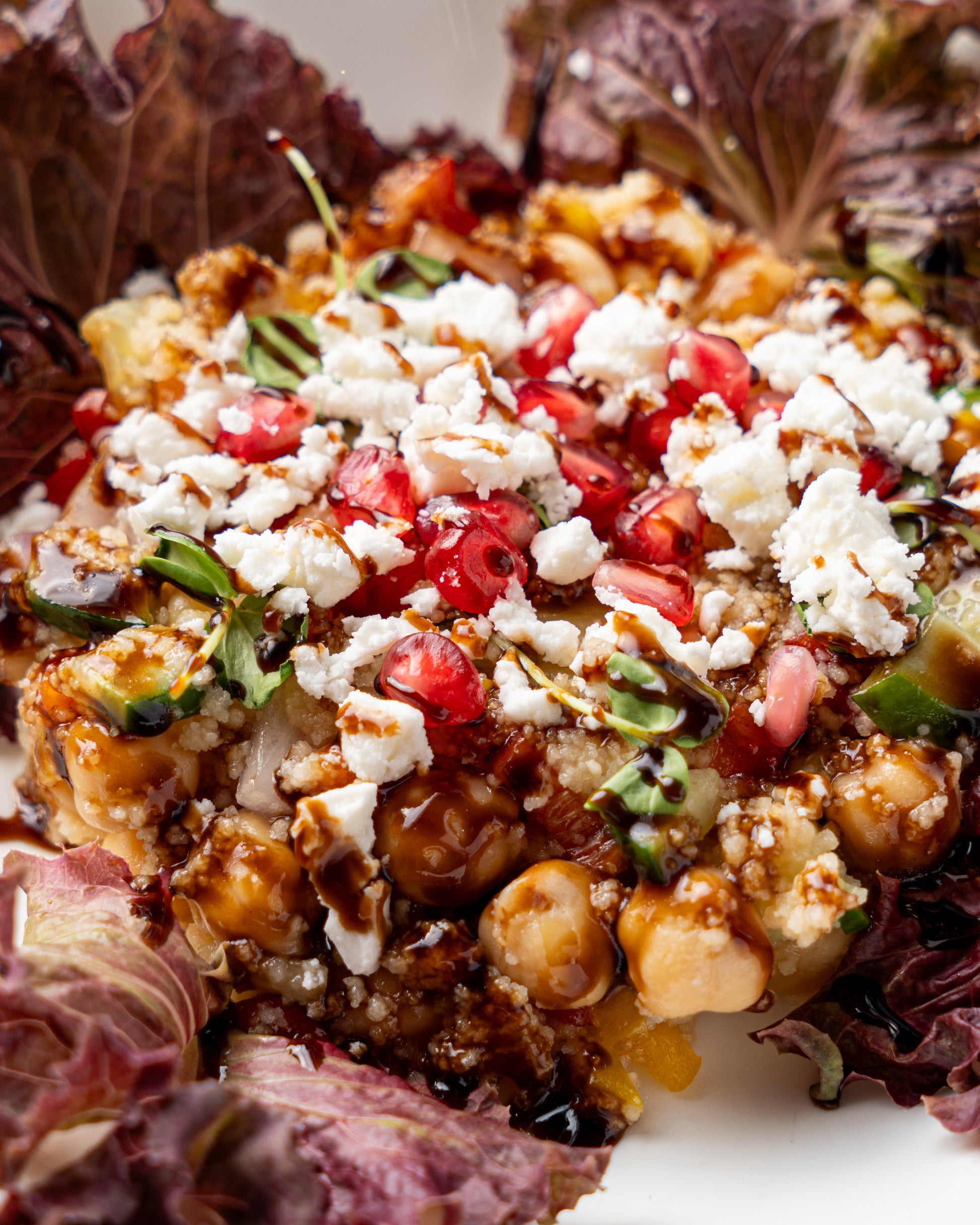 Wholesome bowl of red quinoa, greens, citrus zest, lettuce, tomatoes, carrot, beetroot, cucumber, avocado, apricot, feta cheese & pomegranate dressing. Kcal 400